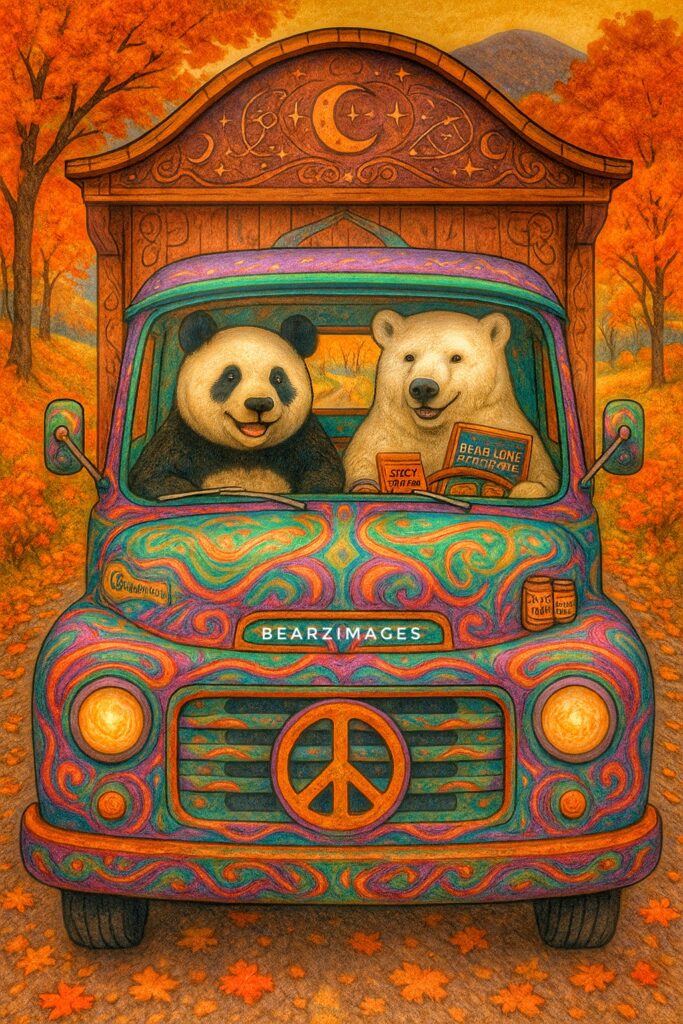 Down that road came the hippie weather truck—a vintage relic painted in swirling tides of turquoise, violet, and sunrise orange. Its grill bore the great symbol of peace, a promise of gentle rebellion and eternal harmony, while its wooden camper, hand-built with love, rose like a rolling temple. Celestial carvings of moons, stars, and spirals danced across its beams, as if the very night sky had agreed to travel with them. The front plate read simply: BEARZIMAGES.