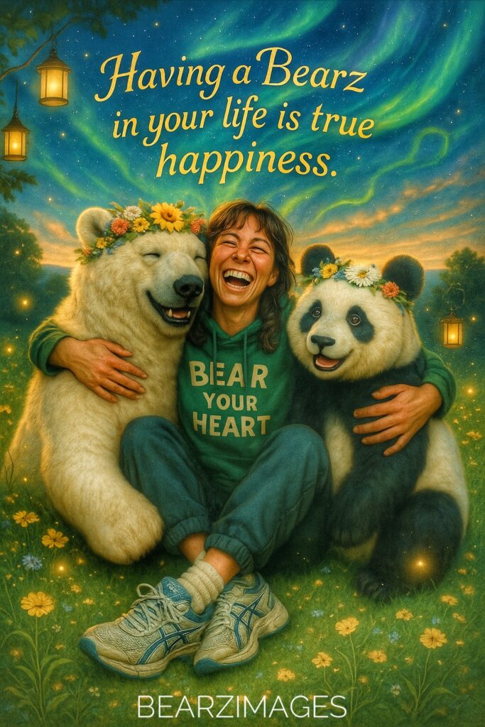 She dropped to her knees in disbelief and delight, her green sweatshirt reading “BEAR YOUR HEART” pulsing like a mantra against her chest. The moment they embraced, time folded inward like a petal curling to kiss its center. With flower crowns placed gently on furry heads and joy erupting like fireworks inside her chest, Lumi remembered—these Bearz were not just companions. They were soul guides, protectors of the inner child, the lost laughter, the unconditional love.