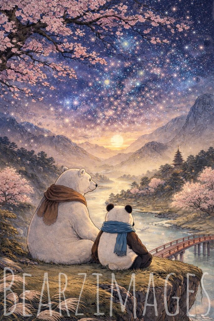 a Polar Bear and a Panda Bear sit at the edge of the world.