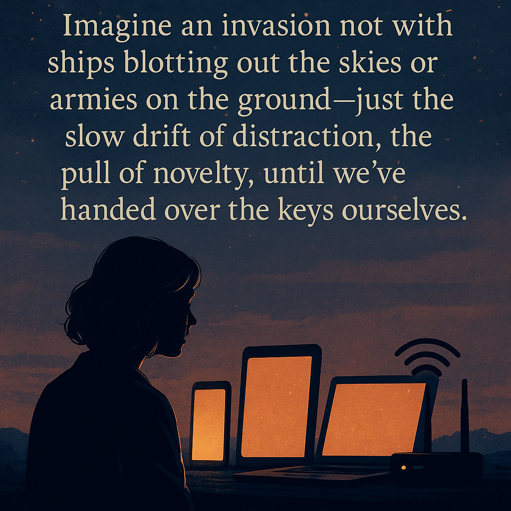 The realization hit hard: the invasion had been here all along, invisible and unannounced. We had invited it through every glowing doorway, every app, every wire. There was no need for ships to land—they were already inside us, inside our habits, inside the way we forgot to notice our own breath.
