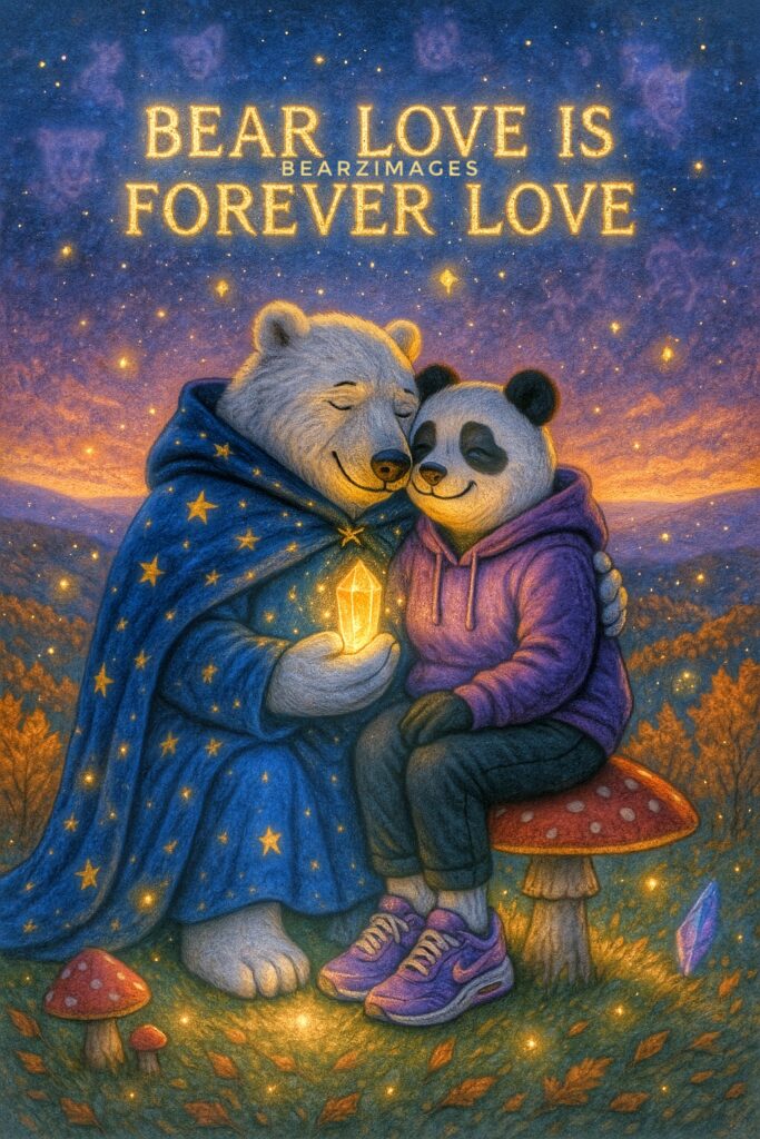 Behind them, if you look closely, the outlines of their past lives shimmer faintly in the starlit clouds: two bears walking a long dirt road, another pair dancing on a mountaintop, two shadows curled in a cave of dreams. Even now, the crystal glows brighter as they sit together—because Bear Love, true Bear Love, is not bound by flesh or time.