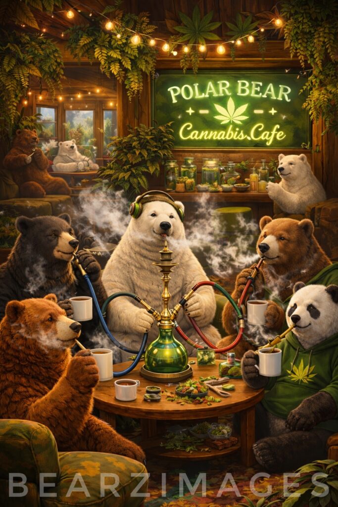 A polar bear sits at the center like a quiet anchor, headphones resting over fur as if tuned to a deeper frequency—the kind that plays beneath thought. Around him, a grizzly bear leans back with a storyteller’s ease, a black bear watches with soft, knowing eyes, and a panda bear in a green hoodie exhales something more than smoke—something like letting go.