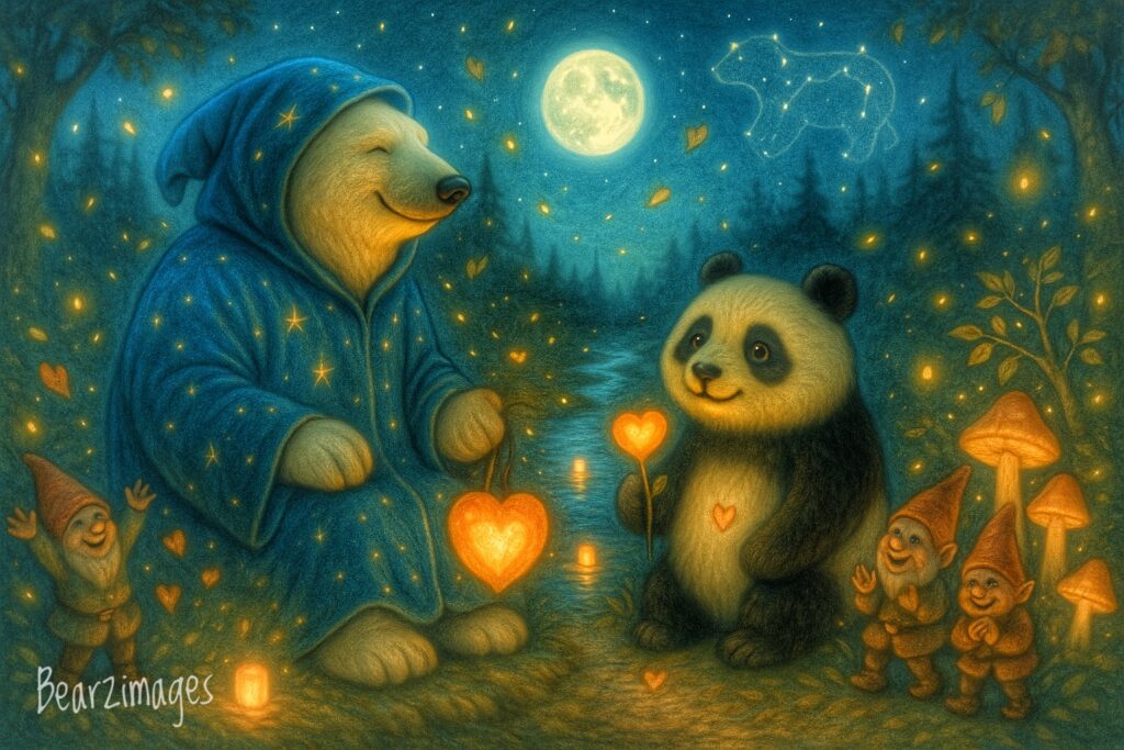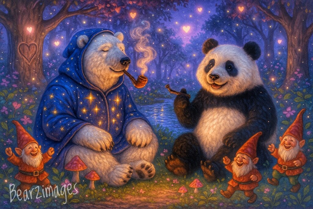 And as Björn puffed spirals of wisdom into the night air and Panda smiled with a heart full of memory, they both knew: this was home—not a place, but a presence. A sacred reunion written in stardust, carved in bark, and sealed with gnome giggles under a moon that never forgets love’s true shape.
